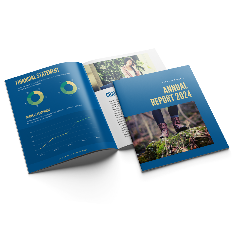 Open annual report 2024 with financial charts and a person hiking in nature on the cover.
